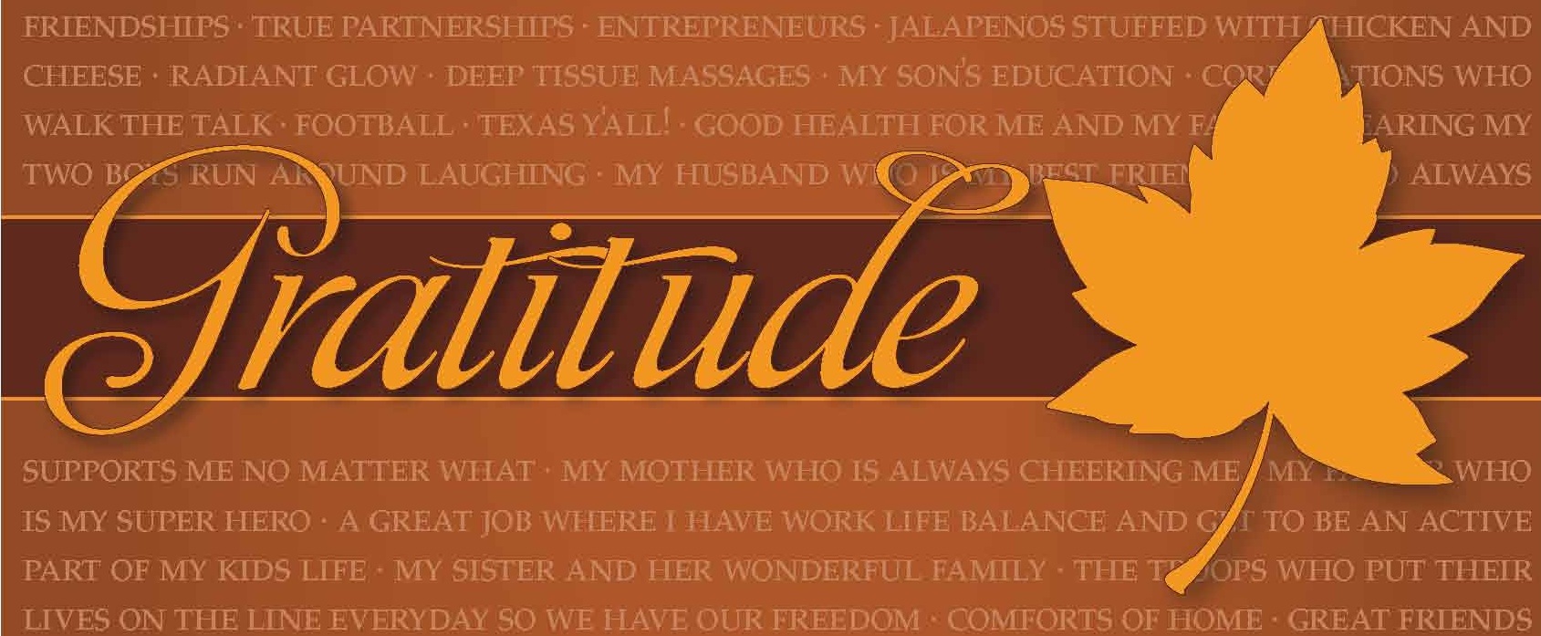 We are grateful for … sunny afternoons and moonlit nights – spontaneous enthusiasm – hugs from our children – cheese and olives – tough love – giving without expectation – cowboy boots – a great pair of jeans – eyes that sparkle – passionate people – fires on a cold night – french fries! – our troops who put their lives on the line every day so we have our freedom – a happy, healthy family – laughter – loyal friendships – true partnerships – entrepreneurs – jalapenos stuffed with chicken and cheese – Radiant Glow juice – deep tissue massages – our children’s education – companies who walk the talk – football – Texas ya’ll – good health – hearing our children running around laughing – our mothers who cheer us on – our fathers who are our super heroes – our siblings and their wonderful families – comforts of home – great friends who always seems to know what to say – old dogs – girlfriends – carpools – GPS – flowers for no apparent reason – family – valet parking – being able to read the menu at a restaurant – a good haircut and color – reuniting with college friends … for these things and many others, we are grateful.